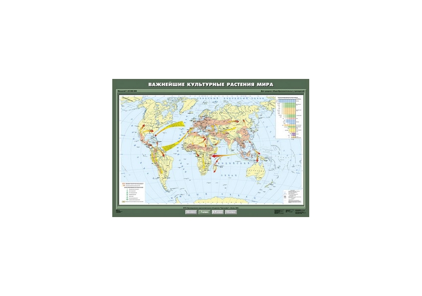 Цветным фоном на карте даются территория распространения мотыжного орошения, неорошаемого, подсечно-огневого земледелия до н.э. Цветными стрелками обозначены пути распространения культурных растений. Центры происхождения культурных растения даны цифрами. Пунктирной линией обозначена граница центров происхождения культурных растений.