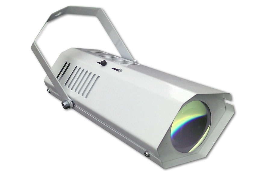 Миниатюрная световая пушка белого или 5-ти цветного луча - профессиональный источник света для зеркального шара. Съемная насадка с цветными полосками. Набор диафрагм для изменения ширины луча. Может использоваться, как проектор несложных трафаретов.